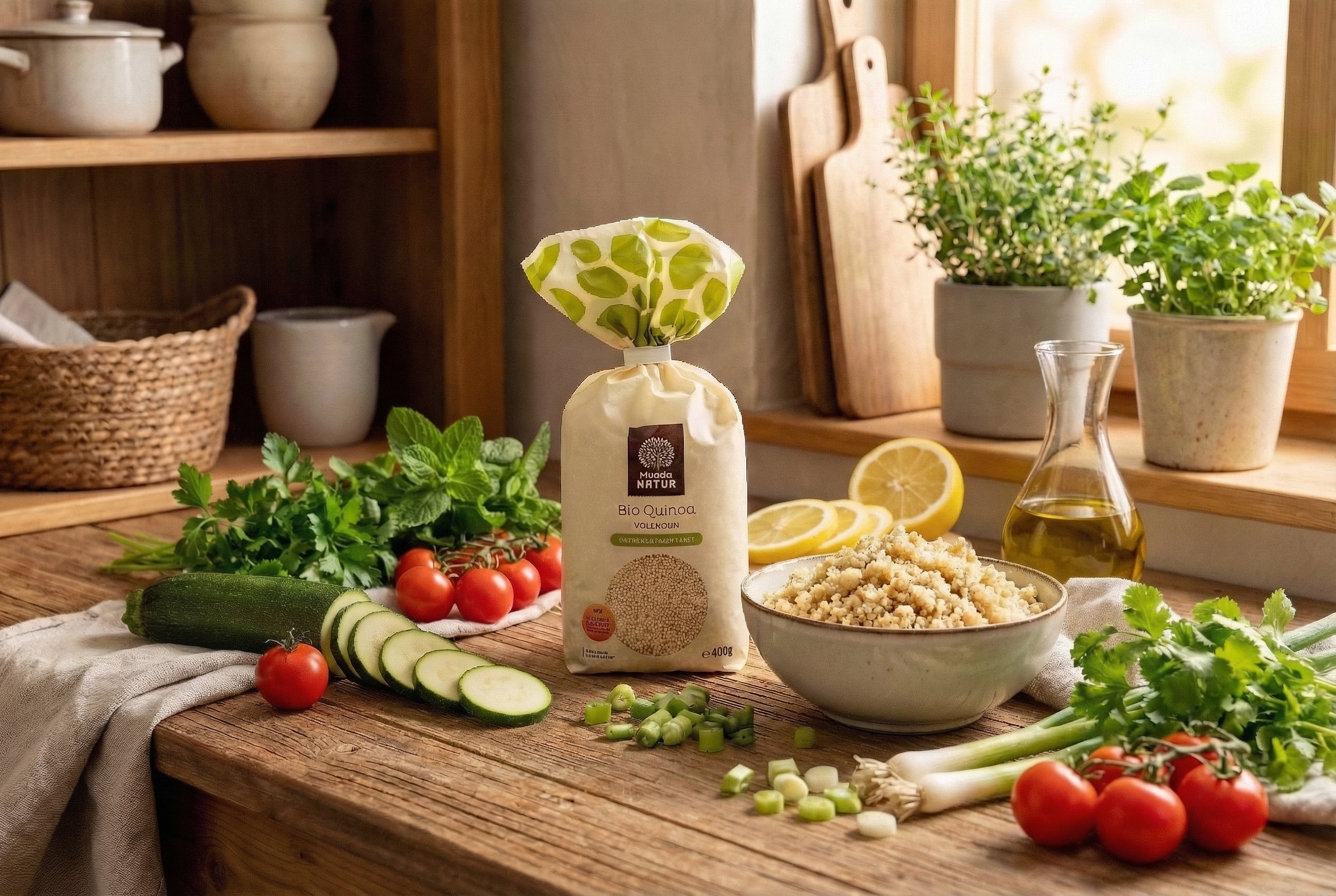 Dieser frische Quinoa-Kräutersalat ist ein leichtes und aromatisches Gericht für warme Tage. Mudda Natur Bio Vollkorn Quinoa liefert eine angenehm nussige Basis und wertvolles pflanzliches Eiweiß, ...