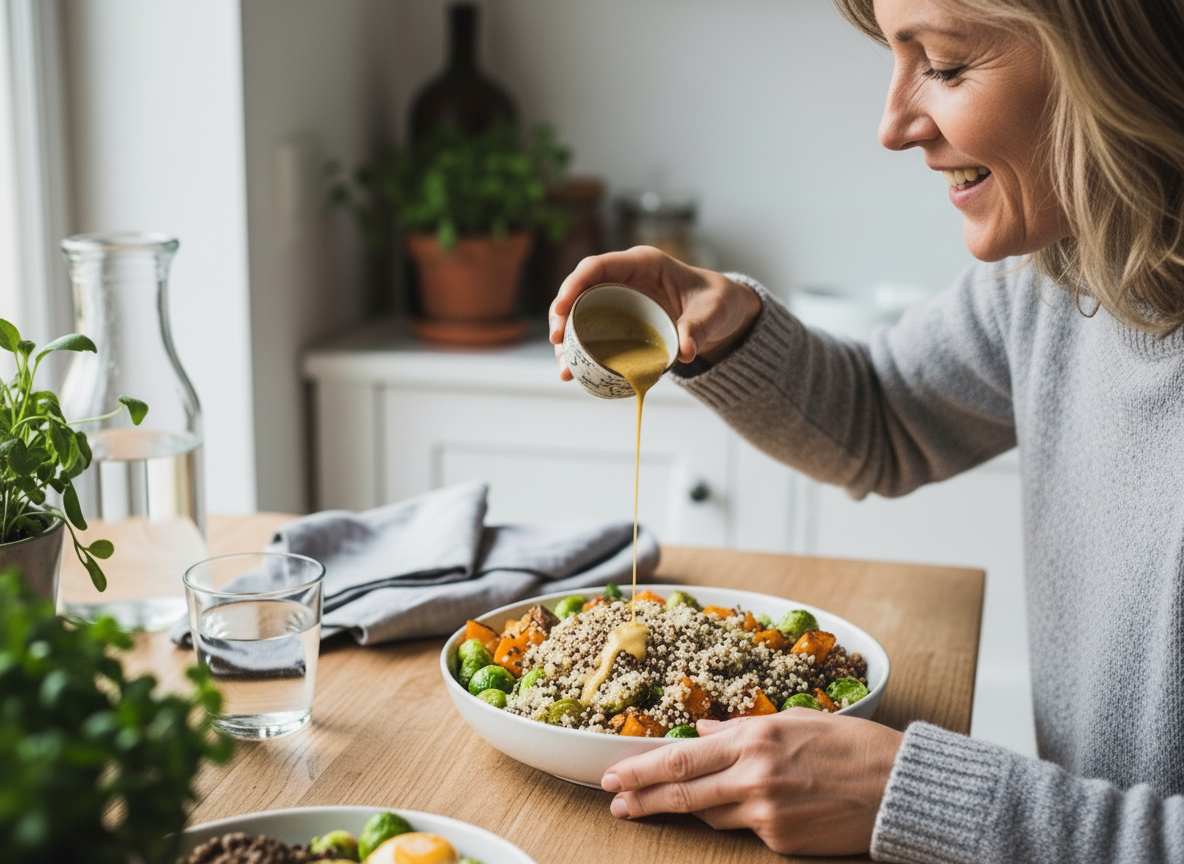 Herbstliche Quinoa-Bowl mit goldenem Tahin-Dressing