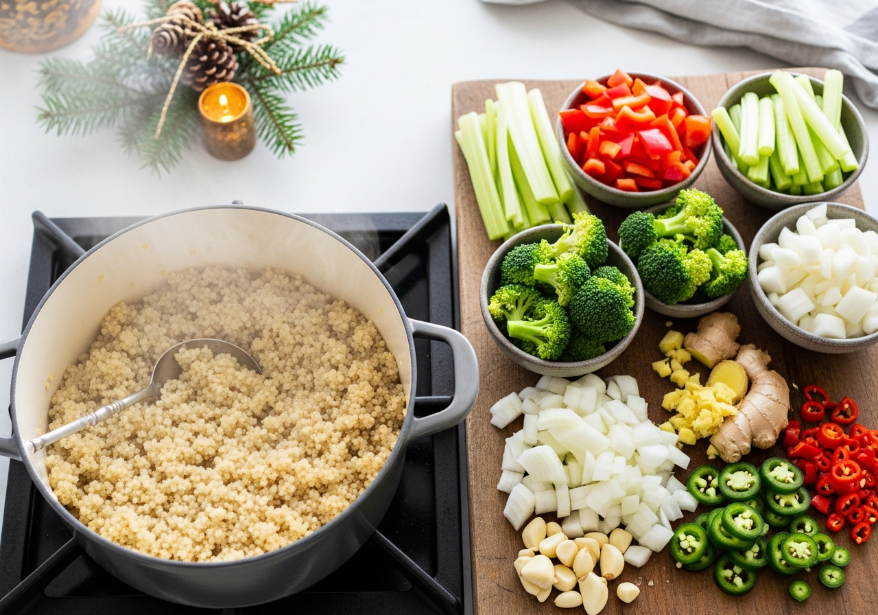 Dieser weihnachtliche Quinoa-Salat kombiniert wärmende Gewürze mit knackigem Gemüse, süß-säuerlichen Cranberries und aromatischen Pecans. Die leichte Schärfe von Jalapeño und Ingwer trifft auf die ...