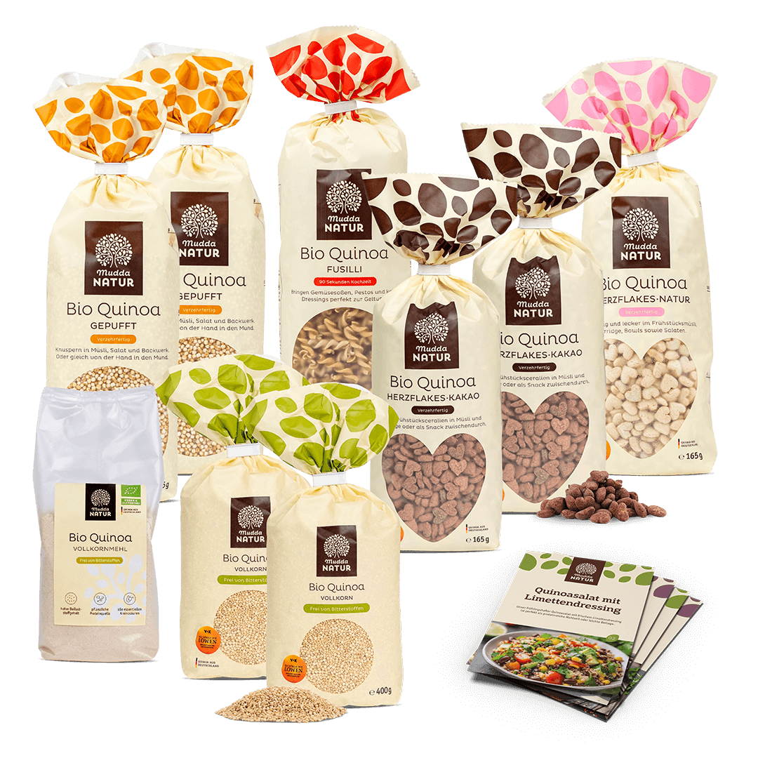 Quinoa ist die perfekte Alternative zu herkömmlichen Getreidesorten, da es nicht nur glutenfrei, sondern auch besonders reich an essenziellen Nährstoffen ist. Es enthält alle neun essenziellen Aminosäuren, ist leicht verdaulich und sättigt langanhaltend. Besonders für eine pflanzliche Ernährung bietet Quinoa eine wertvolle Proteinquelle und liefert zusätzlich Eisen und Magnesium, die zur normalen Muskelfunktion beitragen. Mudda Natur setzt auf nachhaltigen Anbau, bei dem auf chemische Zusätze verzichtet wird und faire Handelspraktiken im Mittelpunkt stehen. Das sorgt nicht nur für höchste Qualität, sondern auch für eine umweltfreundliche und soziale Produktion. Wer sich bewusst ernähren möchte, findet in Quinoa eine ideale Grundlage für eine gesunde und abwechslungsreiche Küche.